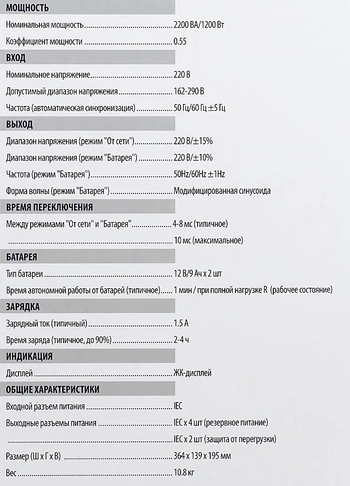 ИБП, документация, кабель питания, 2 кабеля для нагрузки, кабель USB -