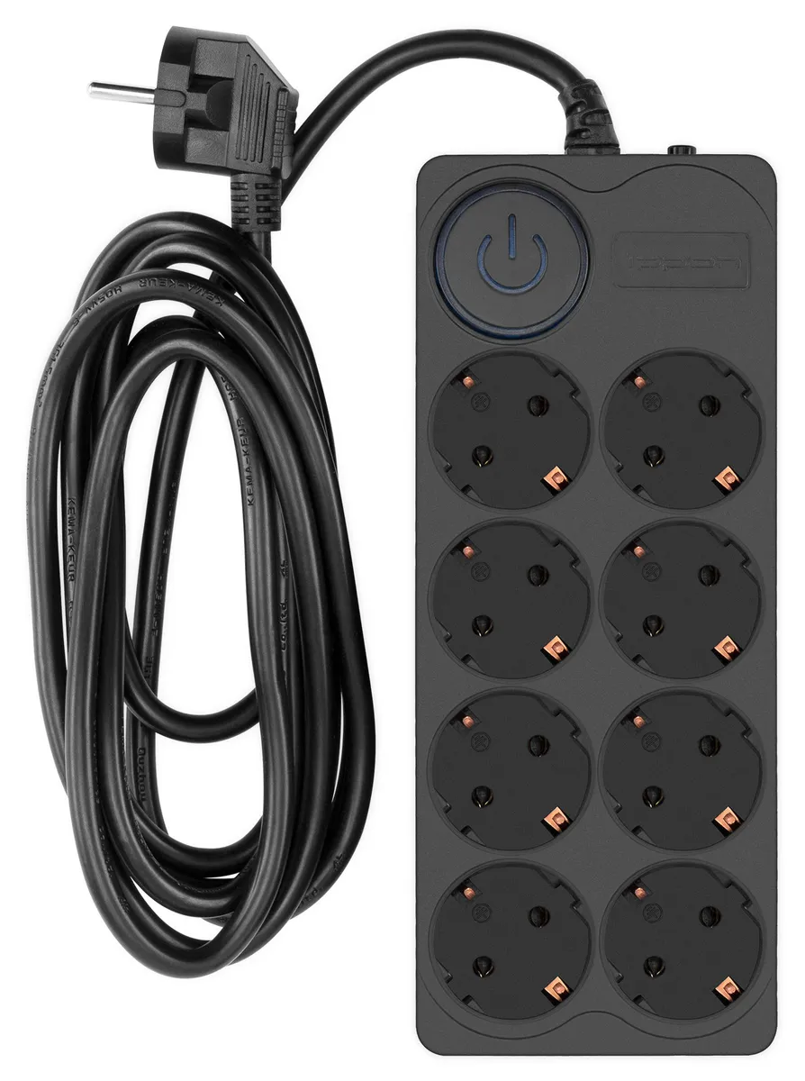 8 евророзеток с заземлением. Входная вилка Schuko. Защита от перегрузки. Защита от импульсов высокого напряжения. Защита от перетирания провода в месте входа в корпус фильтра. Ударопрочный негорючий корпус. Кнопка питания с индикатором сети. -