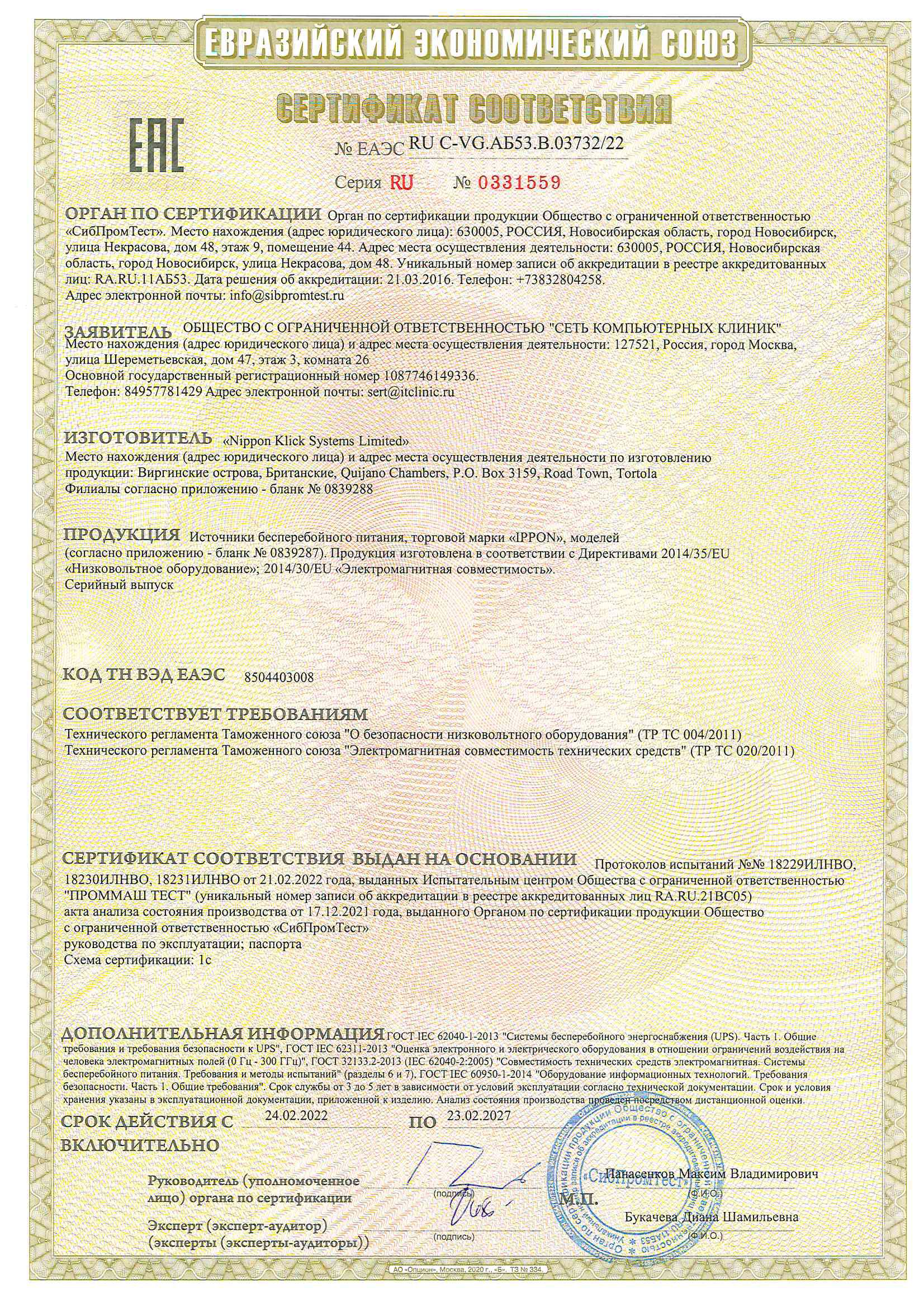 ЕАЭС RU С-VG.АБ53.В.03732/22 | 23.02.2022 | 22.02.2027 |
