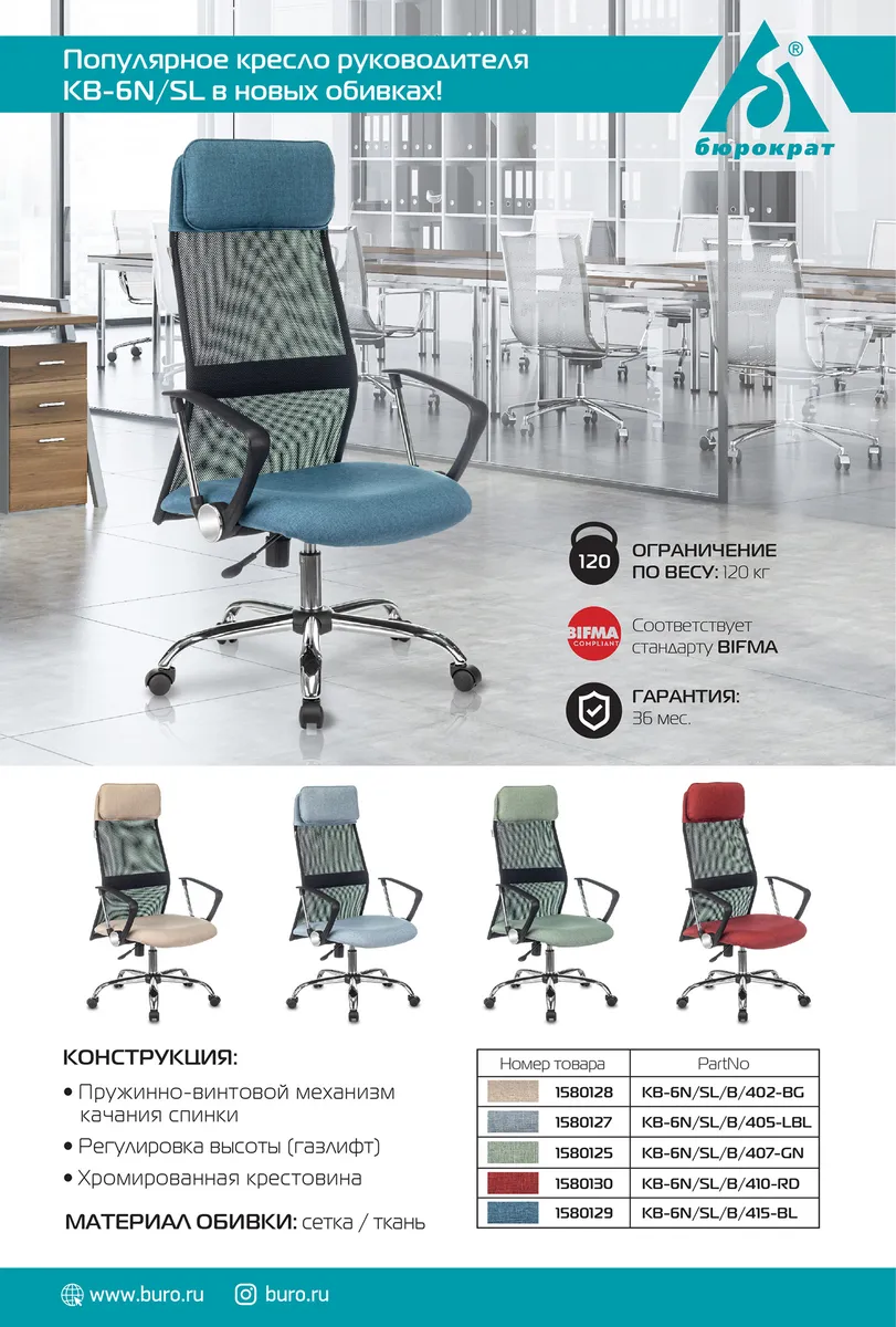 | Кресло руководителя Бюрократ KB-6N черный TW-01 сиденье голубой 38-405 сетка/ткань с подголов. крестов. металл хром | ЕАЭС N RU Д-RU.РА01.В.54929/24 | 10.04.2024 | 09.04.2029 |