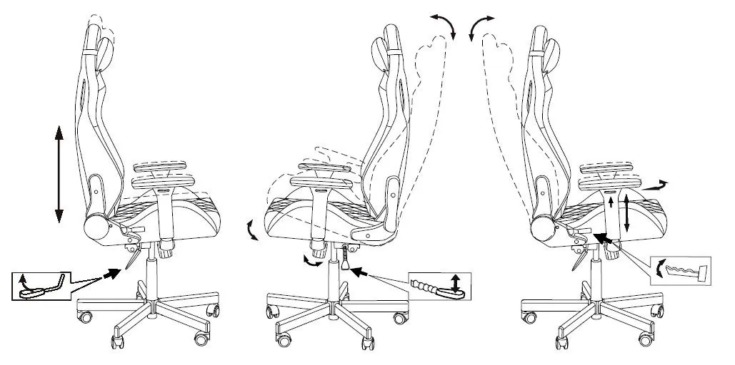 высоты (газлифт), высоты подголовника, жесткости качания, положения подлокотников -