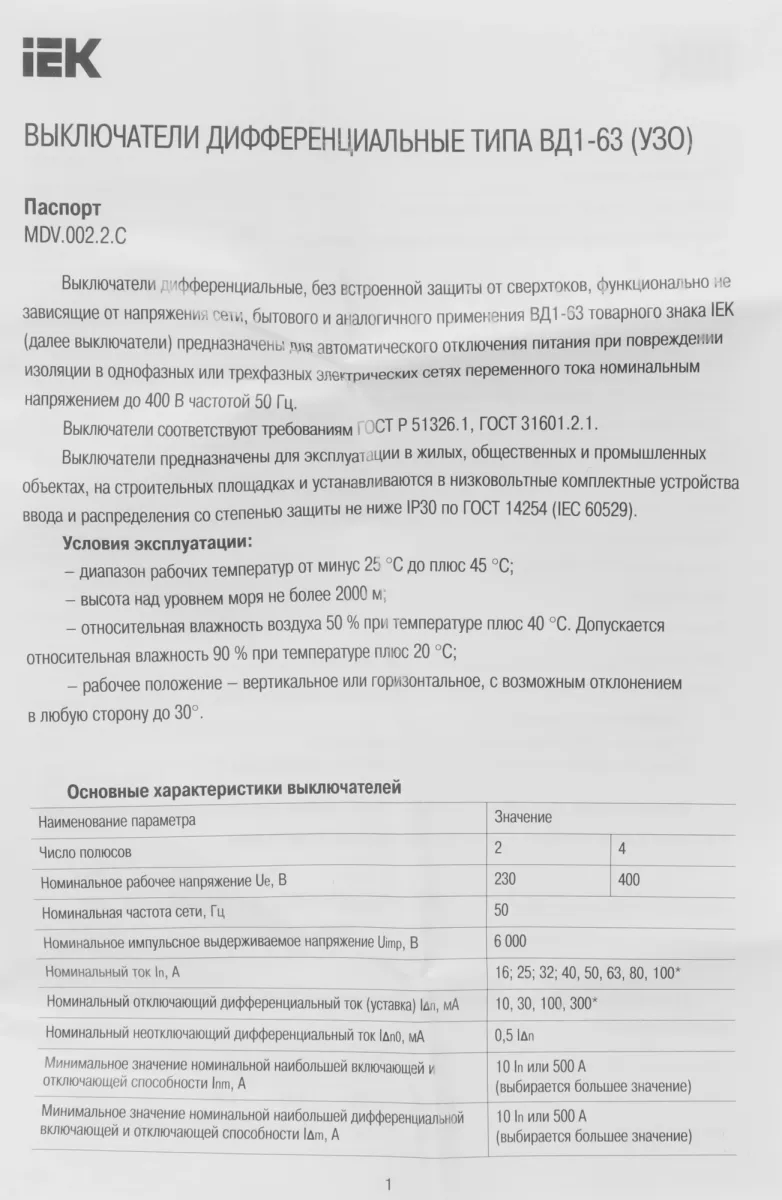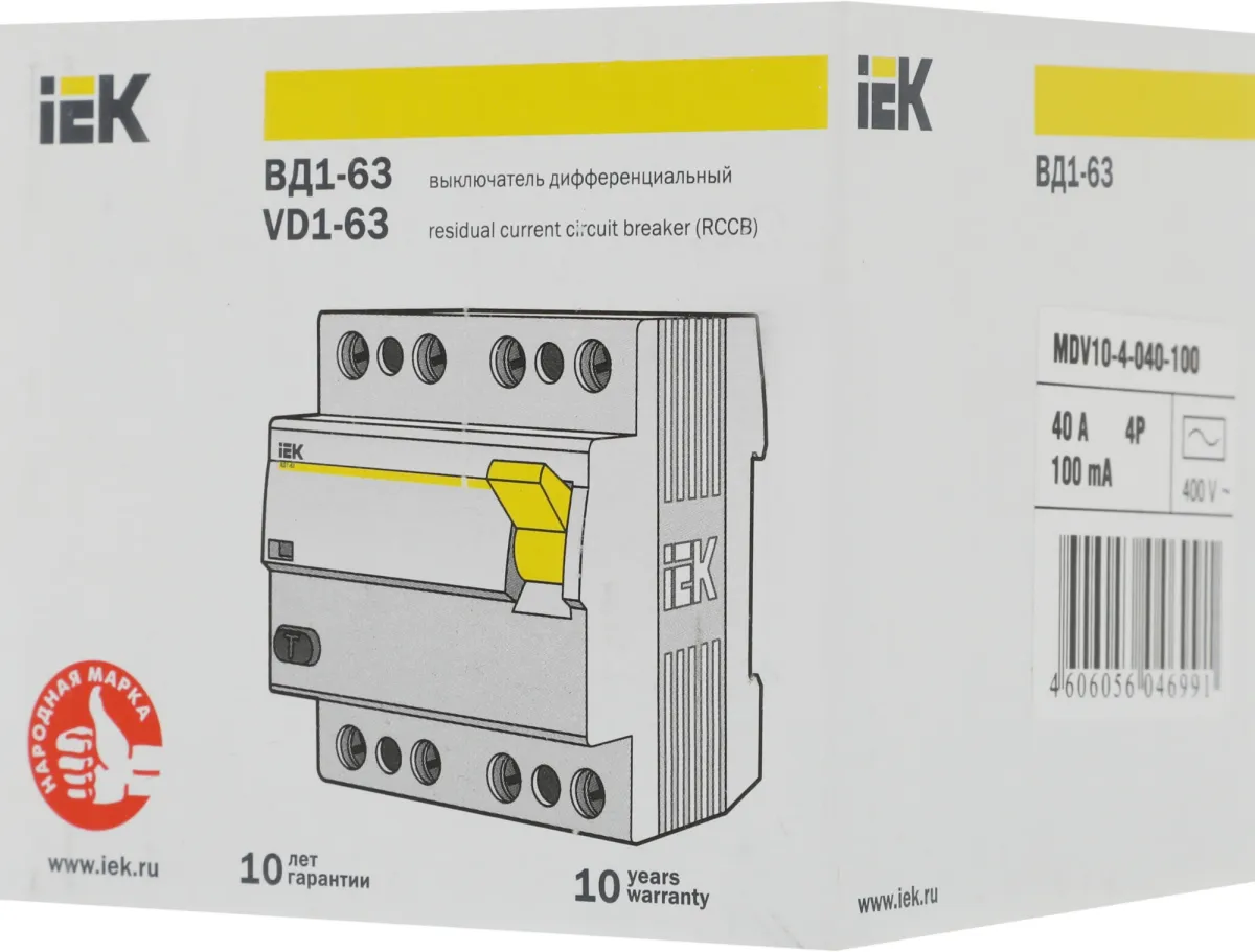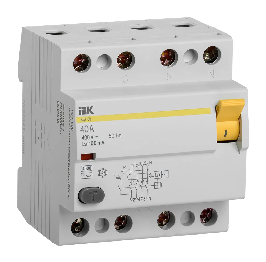 Выключатель дифф.тока УЗО IEK MDV10-4-040-100 ВД1-63 40A 100мА (MDV10-4-040-100)