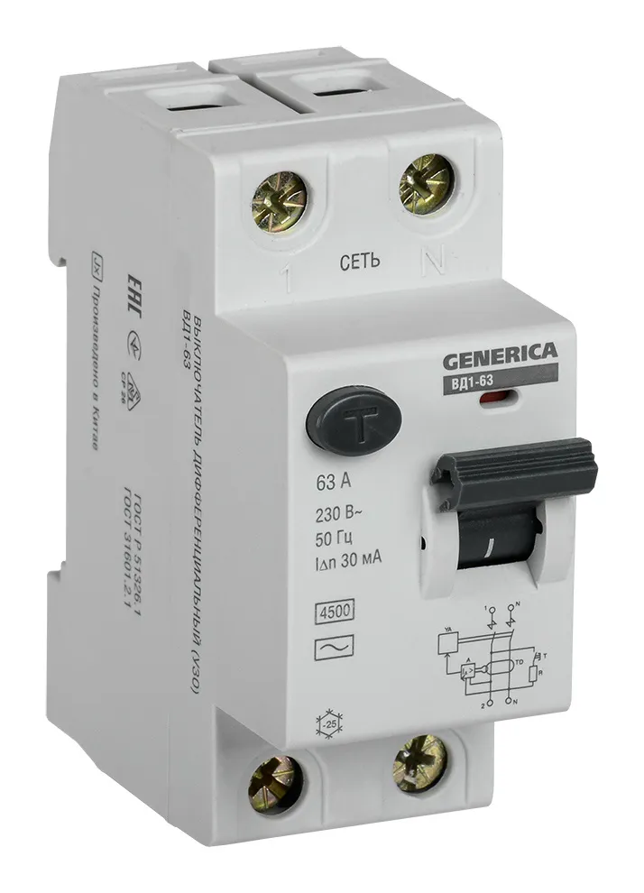 Выключатель дифф.тока УЗО IEK MDV15-2-063-030 ВД1-63 Generica 63A (MDV15-2-063-030)