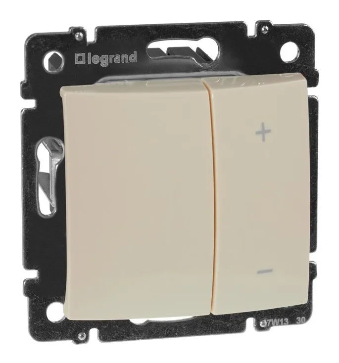 Legrand Valena 774174 используется для управления светом. Оснащен двумя клавишами: одна регулируется яркость, вторая отвечает за включение или выключение освещения. Работает совместно с лампами накаливания или с обмоточными трансформаторами.