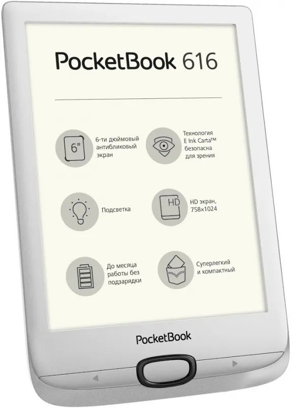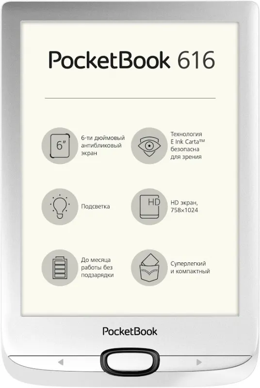 PocketBook 616 – модель начального уровня с совершенно новым ультракомпактным дизайном. Ридер также получил экран последнего поколения E Ink Carta и системой подсветки для чтения при любом уровне освещенности. Все необходимое для комфортного чтения – и по -