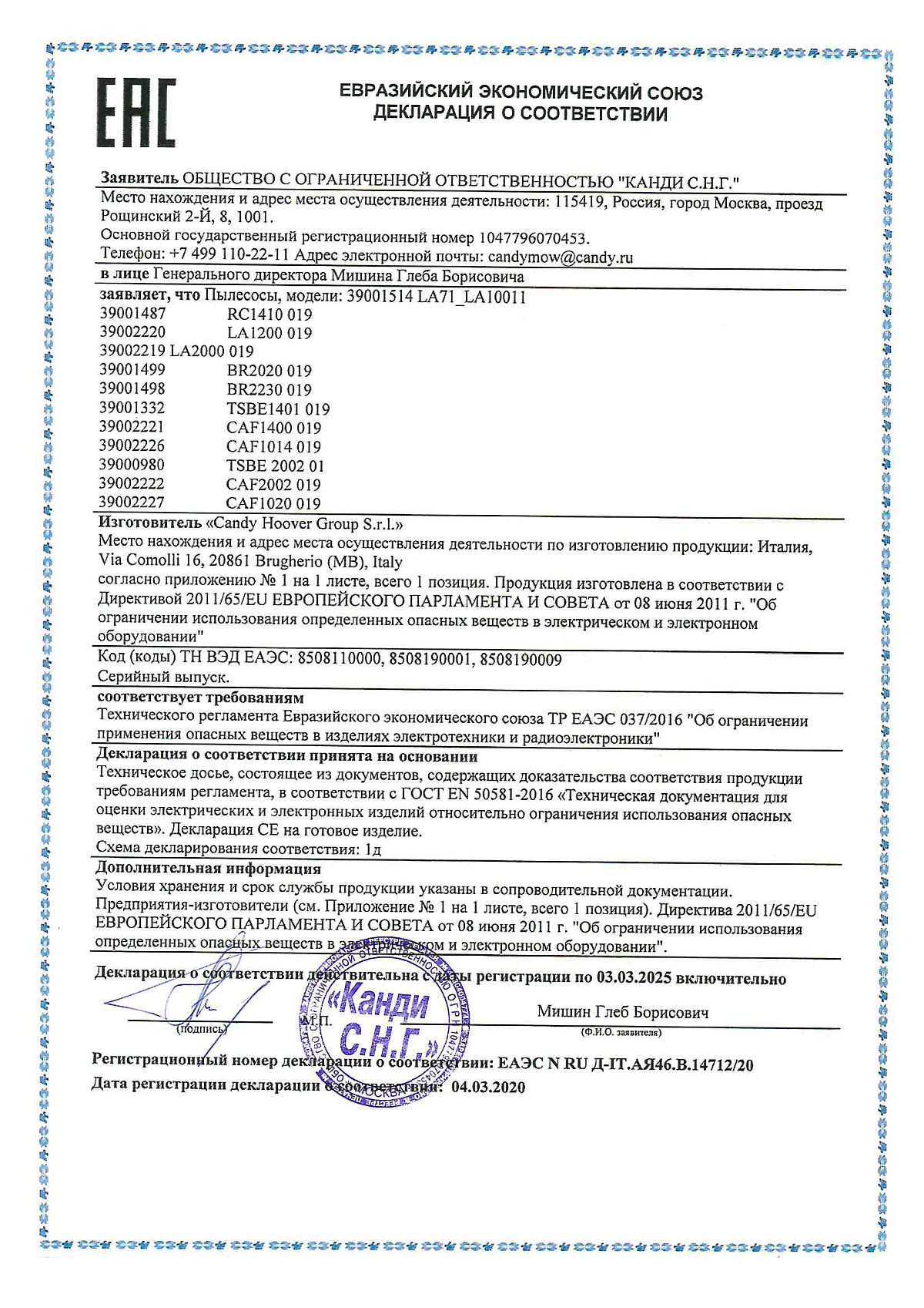| Пылесос Hoover RC1410 019 1400Вт красный | ЕАЭС N RU Д-IT.АЯ46.В.14712/20 | 03.03.2020 | 02.03.2025 |