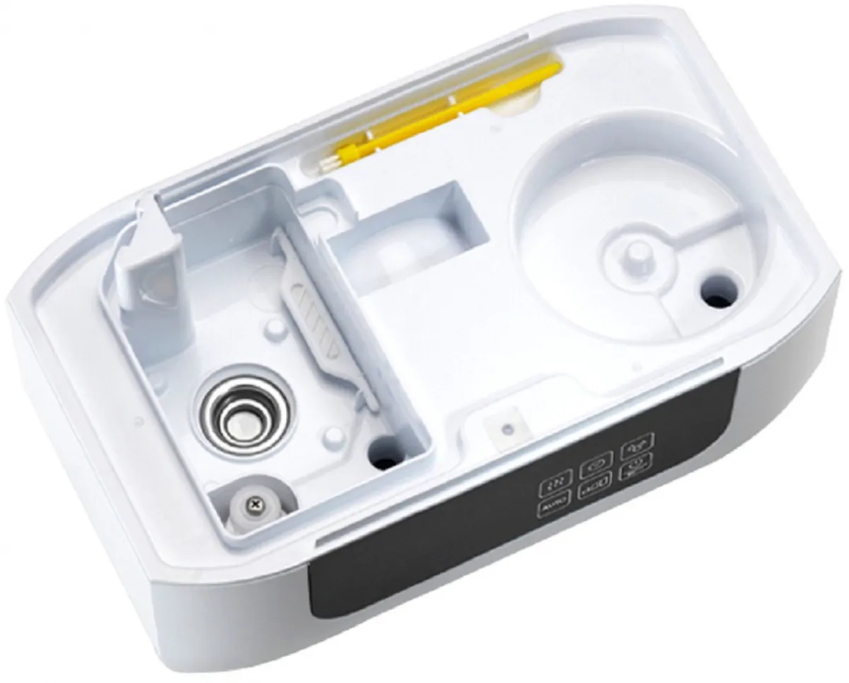 Вместительный бак для воды из прозрачного голубого пластика занимает значительную часть корпуса и подсвечивается мягким светом. В темное время суток прибор выполняет роль красивого ночника. Работа в двух режимах: холодный и теплый пар. Покрытие titanium n -