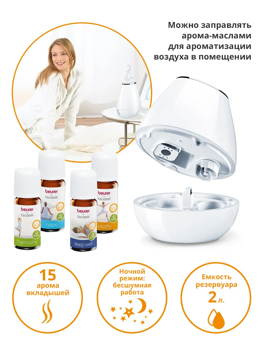 Увлажнитель воздуха с микрораспылением посредством ультразвуковой технологии увлажнения. С ночным режимом: бесшумная работа и кнопка управления без раздражающей подсветки, ароматизация помещения маслами. 2 уровня интесивности увлажнения - 200 мл/ч и 150 м -