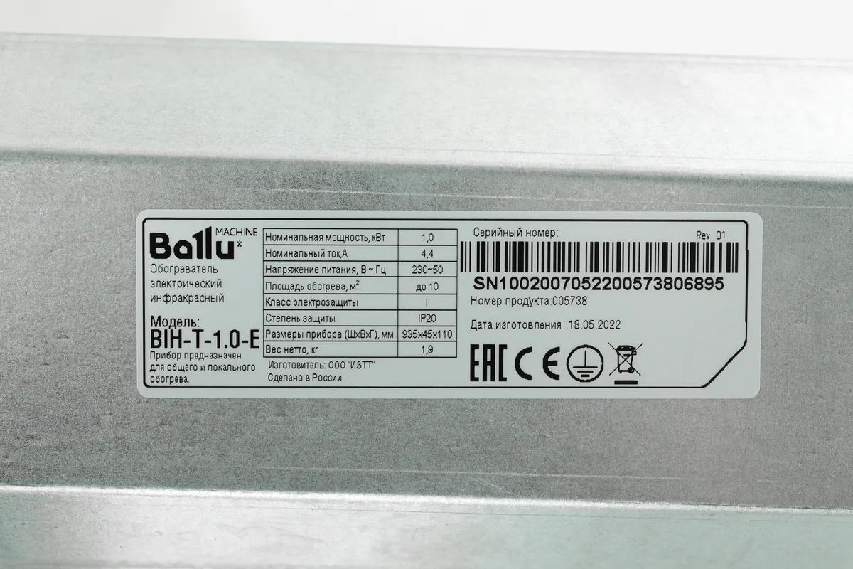| Обогреватель инфракрасный Ballu BIH-T-1.0-E 1000Вт серебристый | ЕАЭС RU С-RU.АЯ46.В.26387/22 | 04.10.2022 | 03.10.2027 |