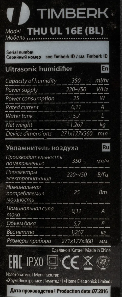 Увлажнитель воздуха Timberk THU UL 16E (BL) 25Вт (THU UL 16E (BL))