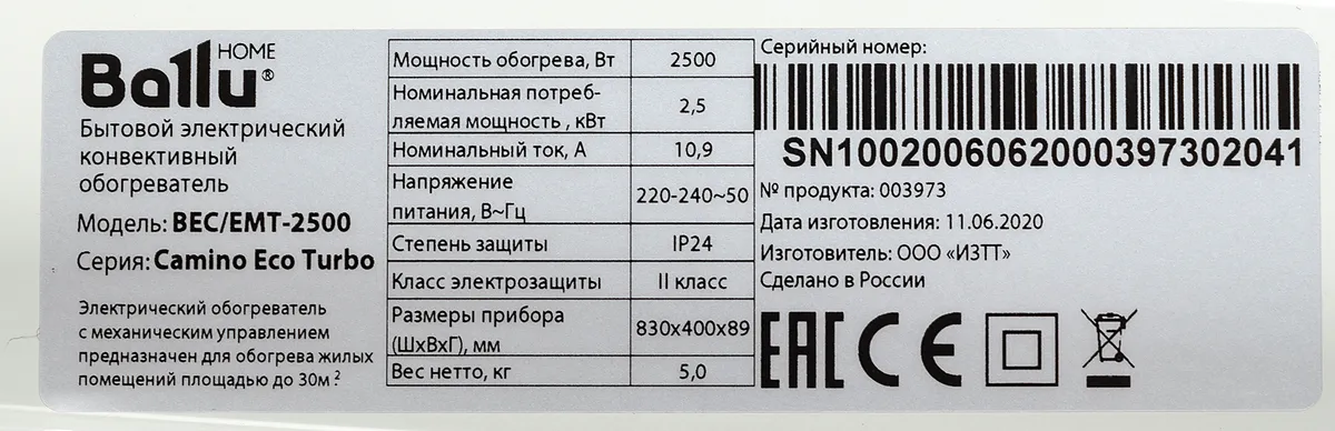 Конвектор Ballu Camino Eco Turbo BEC/EMT-2500 2500Вт белый | ЕАЭС RU С-RU.РТ01.В.03243/21 | 24.02.2021 | 23.02.2026 |