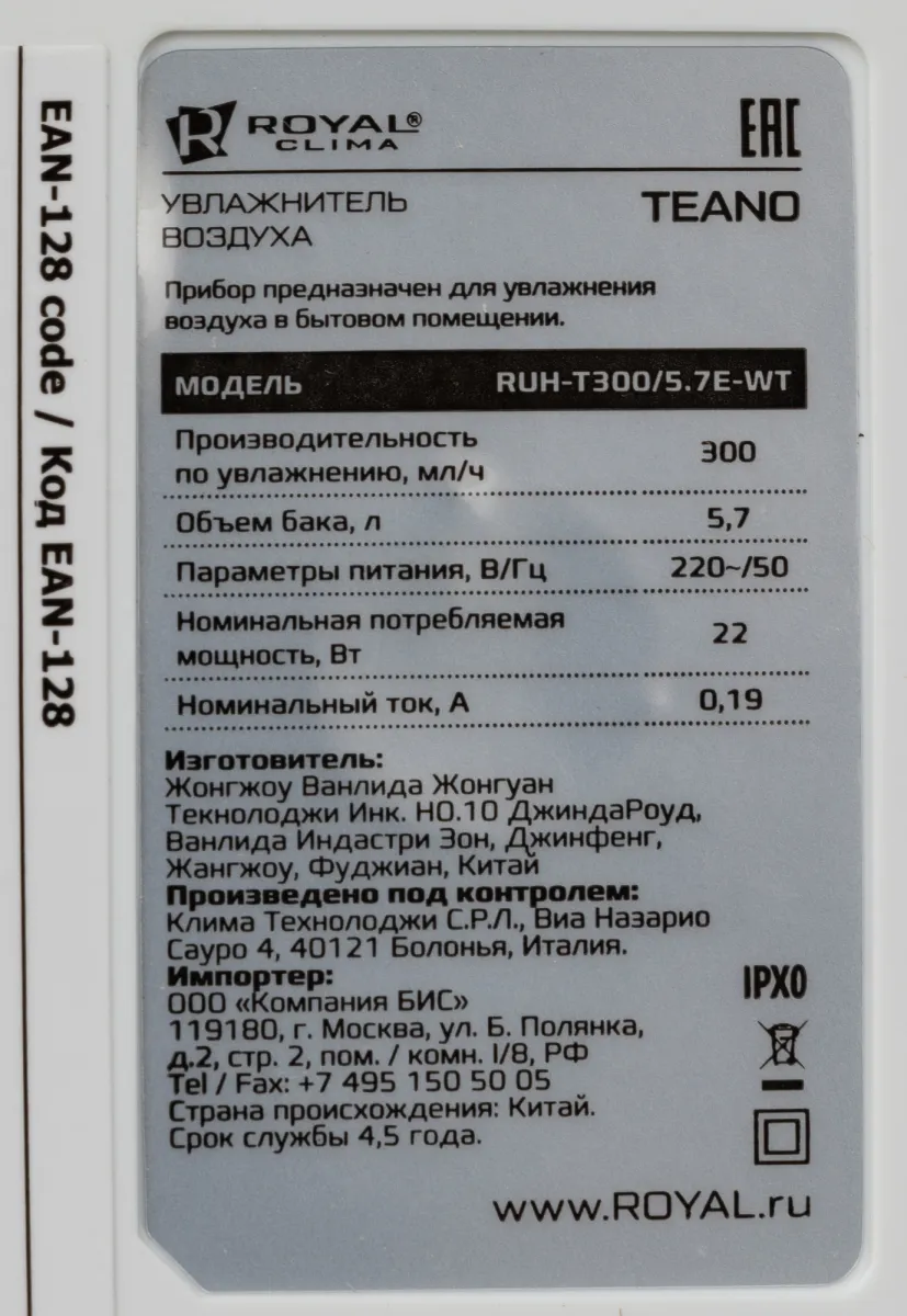 Увлажнитель воздуха Royal Clima RUH-T300/5.7E-WT 22Вт (ультразвуковой) белый (RUH-T300/5.7E-WT)