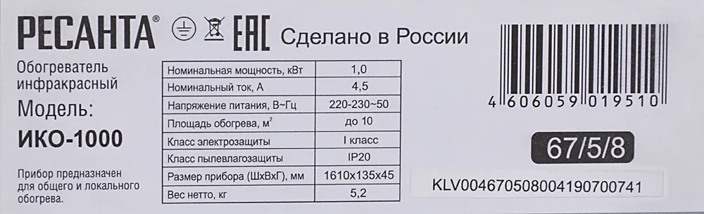 | Обогреватель инфракрасный Ресанта ИКО-1000 1000Вт белый | ЕАЭС RU С-HK.НВ46.В.02411/24 | 23.05.2024 | 22.05.2029 |