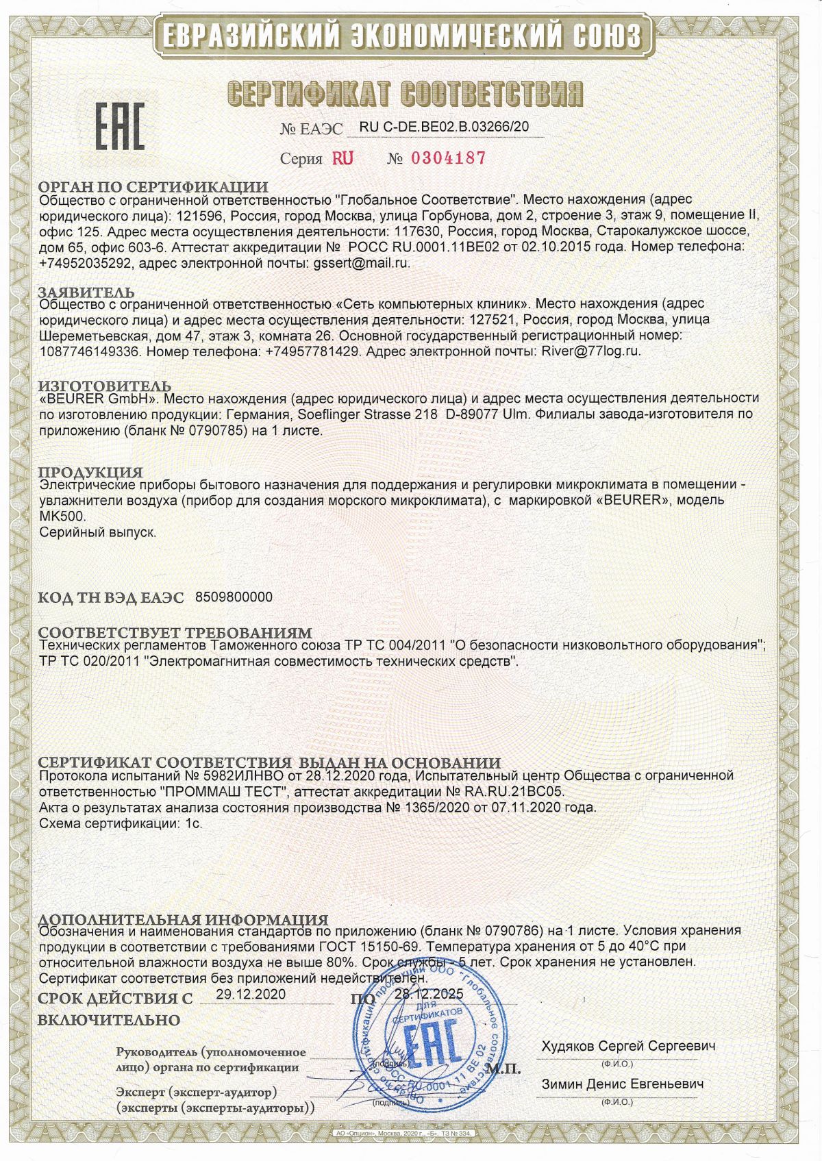 | Увлажнитель-очиститель воздуха Beurer MK500 24Вт белый | ЕАЭС RU С-DE.ВЕ02.В.03266/20 | 28.12.2020 | 27.12.2025 |