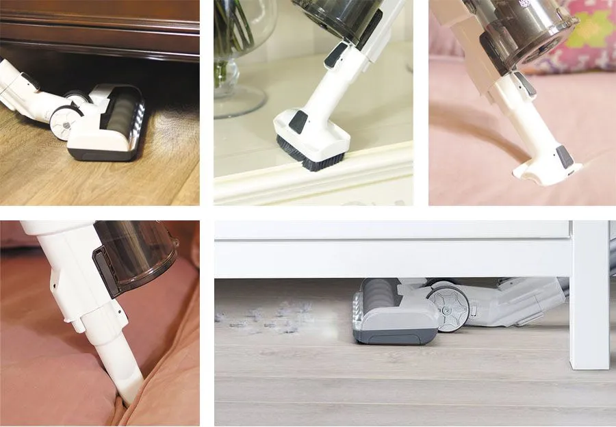 Легкая замена аккумулятора и фильтра. Легкоснимаемый ролик из микрофибры. Настенный держатель с зарядной станцией и держателем для принадлежностей. LED индикатор зарядки. -