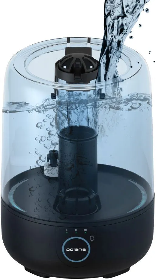 Верхний залив воды. Сенсорная панель управления. 3 скорости подачи пара. Водный резервуар с подсветкой. Индикация недостатка воды в резервуаре. Автоматическое отключение при отсутствии воды. Мощность: 30 Вт. Расход воды - до 350 мл/ч. До 25 часов непрерыв -