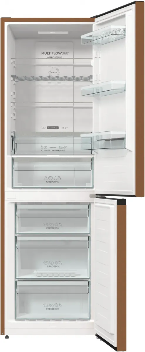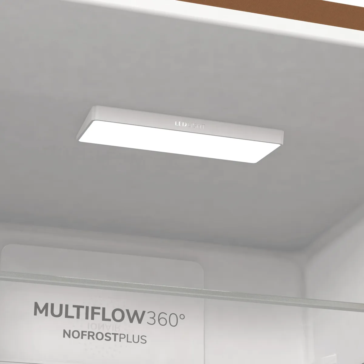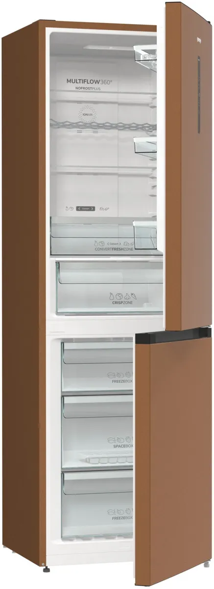 Технология IonAir и система MultiFlow 360°. Контейнер для овощей CrispZone с контролем влажности HumidityControl. AdaptTech: адаптивная технология охлаждения. Режим Эко. Конвертируемый контейнер FreshZone. Увеличенный ящик SpaceBox (38 л). -