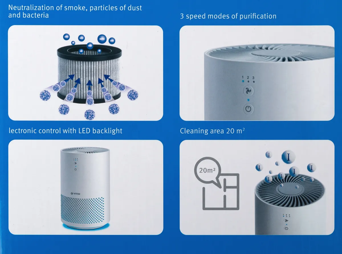 Создать в помещении площадью 20 м2 идеальный микроклимат способен очиститель воздуха VITEK VT-8553. Простое и понятное электронное управление позволяет легко выбрать одну из трех скоростей работы прибора, идеально подходящую именно вам. -