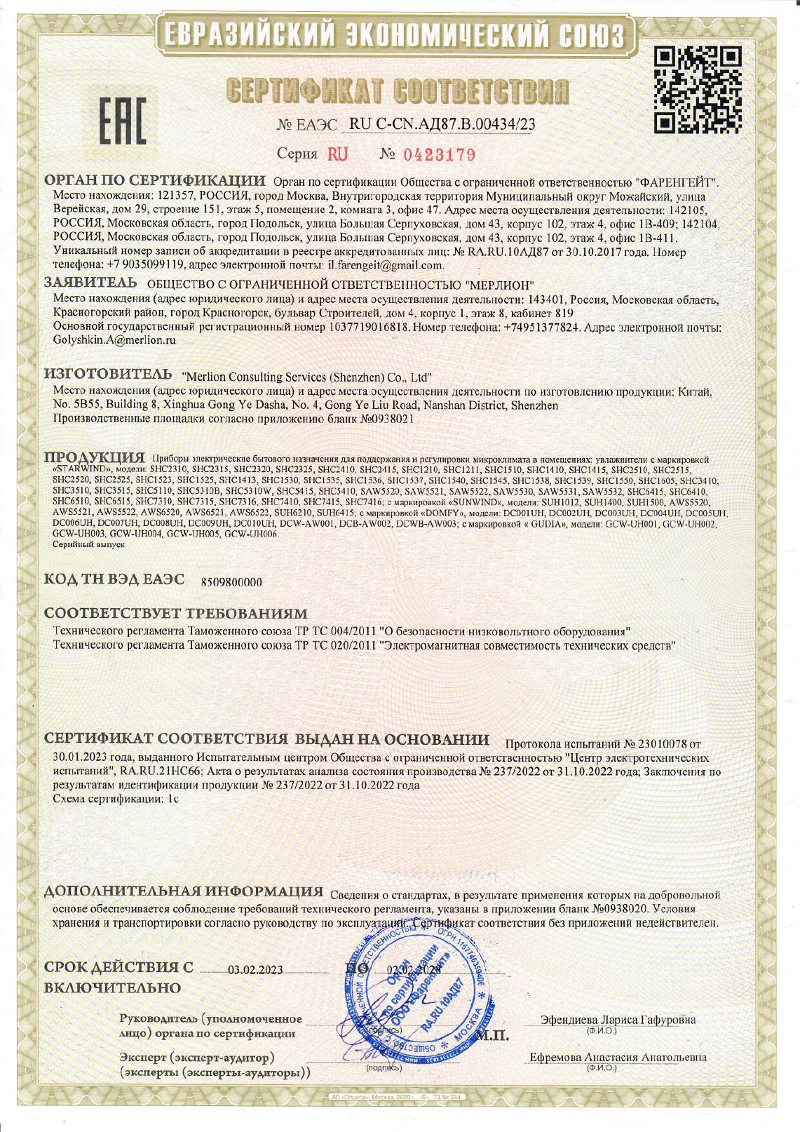 ЕАЭС RU С-CN.АД87.В.00434/23 | 02.02.2023 | 01.02.2028 |
