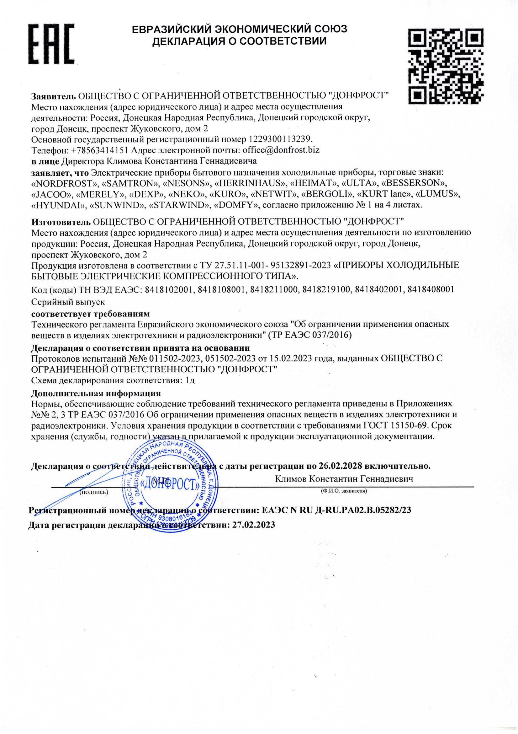 ЕАЭС N RU Д-RU.РА02.В.05282/23 | 26.02.2023 | 25.02.2028 |
