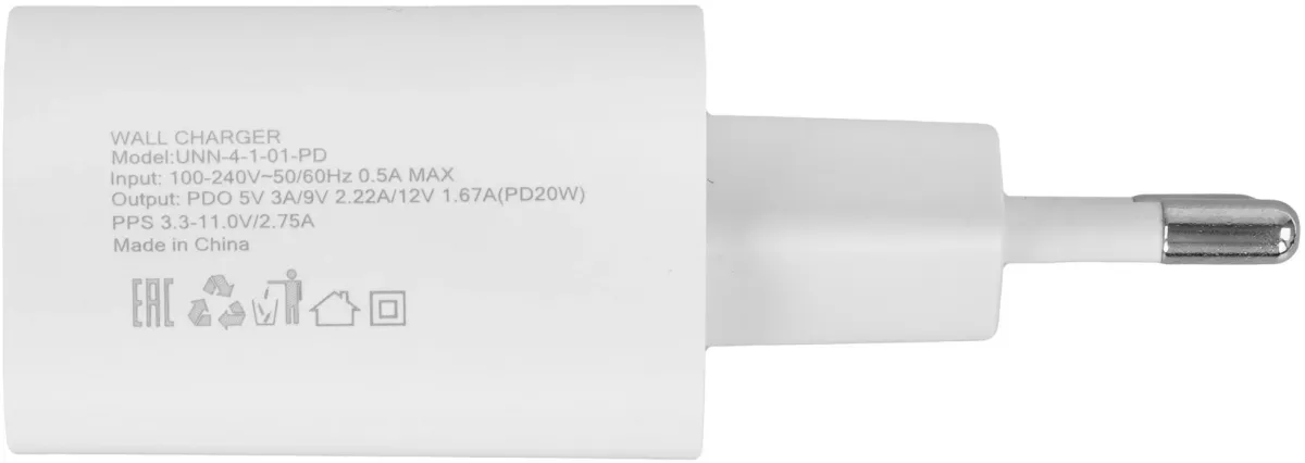 Сетевое зарядное устройство (с питанием от сети переменного тока) • прочный корпус из качественного пластика • 1 USB-порт Type-C • поддержка быстрого протокола PD • мощность 20 Вт • защита от перегрузки по току, перегрева -
