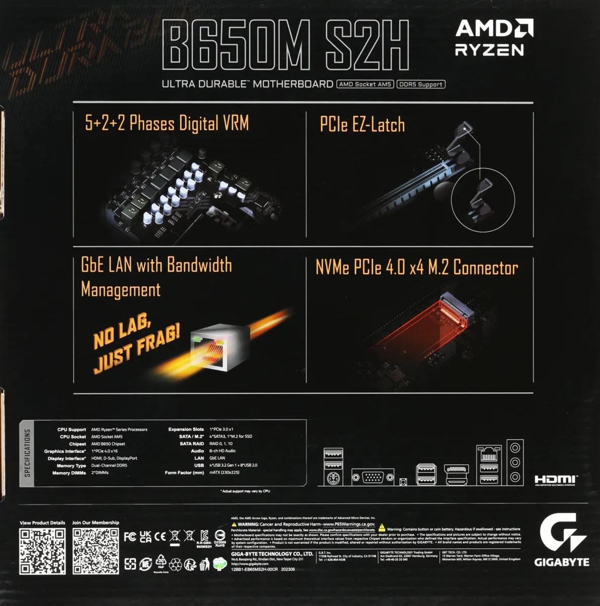 GIGABYTE B650M S2H, AM5, B650, 2*DDR5, DP+HDMI+D-sub, 4 SATA 6 Гб/с, (B650M S2H)