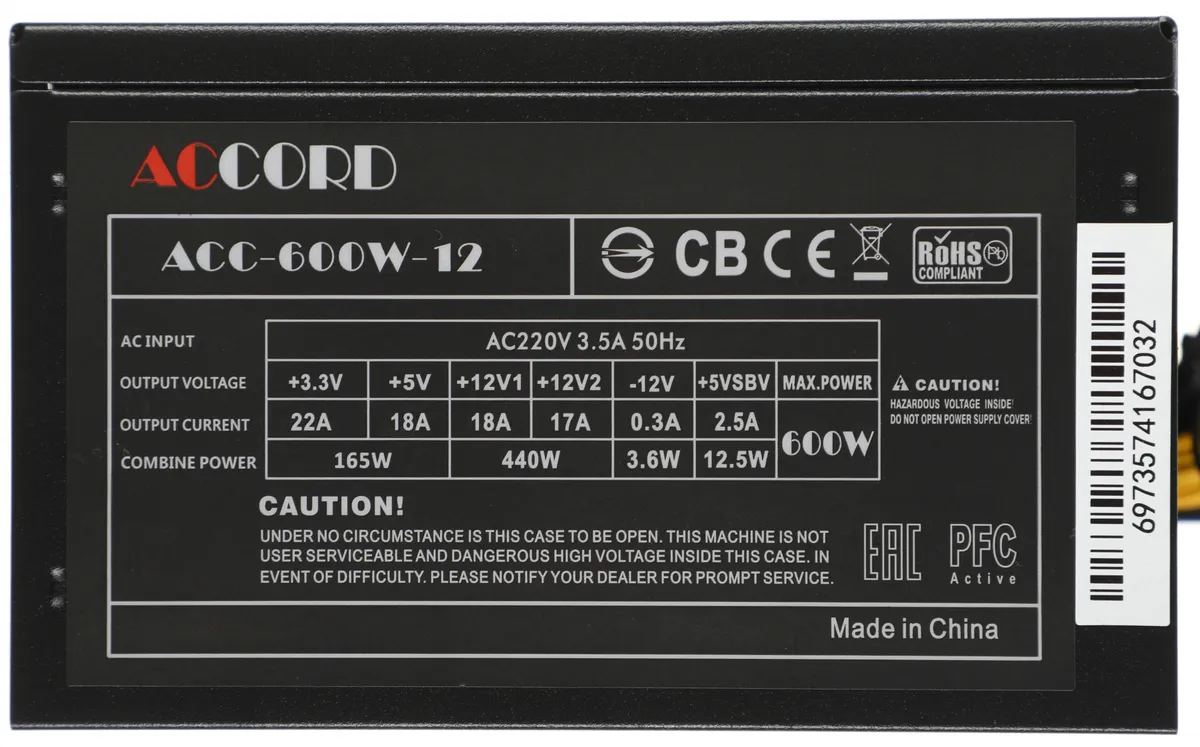 | Блок питания Accord ATX 600W ACC-600W-12 (20+4pin) 120mm fan 4xSATA | ЕАЭС RU С-CN.НА39.В.00037/21 | 28.02.2021 | 27.02.2026 |