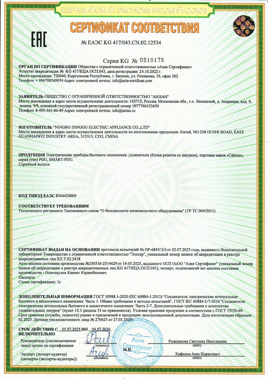 ЕАЭС KG CN С.KG417/043.02.12534 | 04.07.2025 | 03.07.2030 |