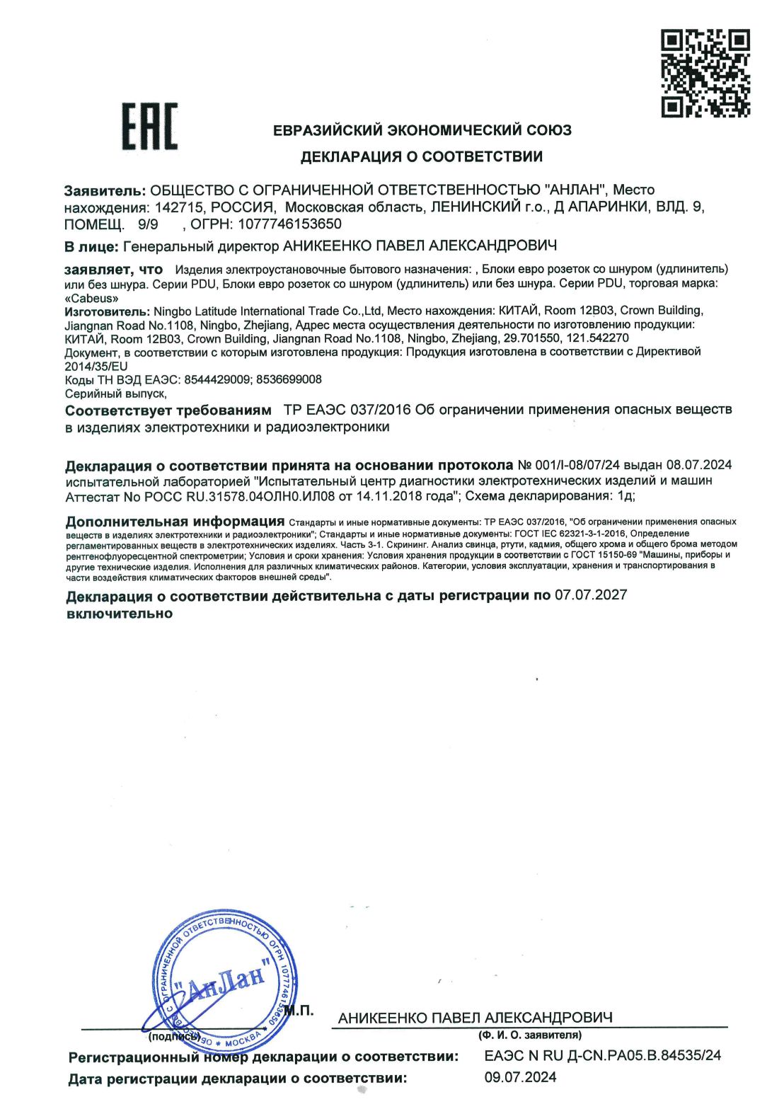 ЕАЭС N RU Д-CN.РА05.В.84535/24 | 08.07.2024 | 06.07.2027 |