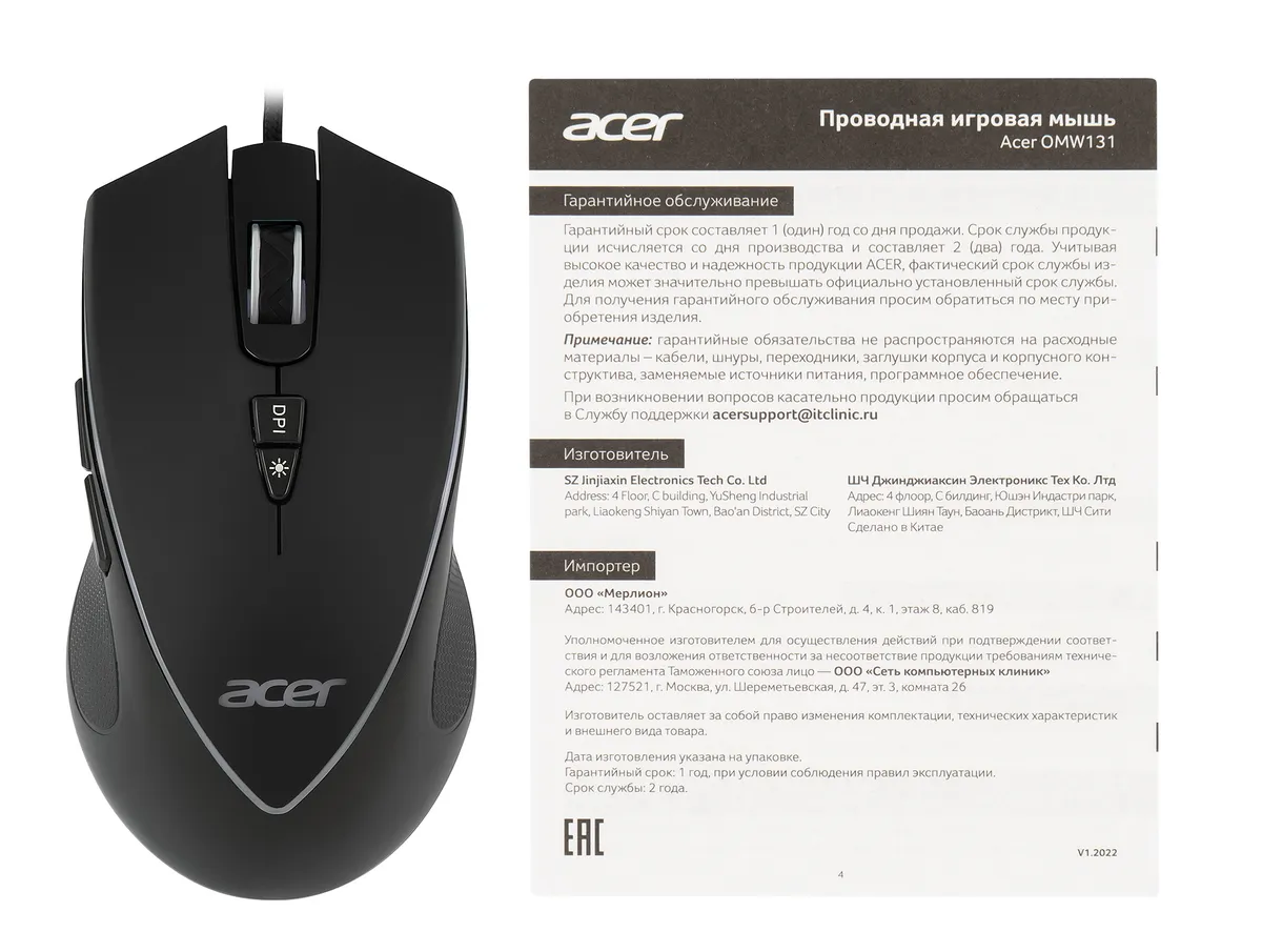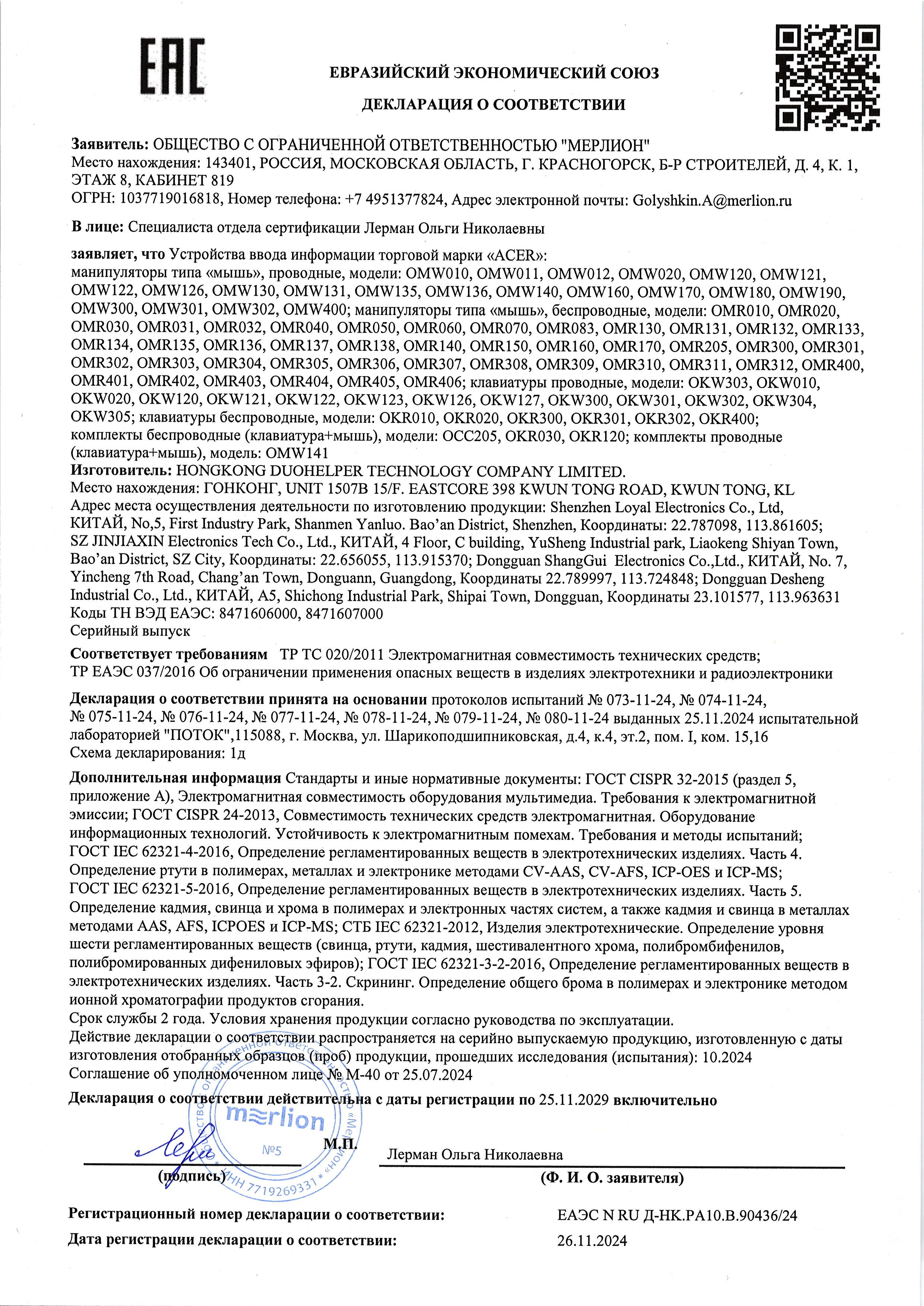 | Мышь Acer OMW131 черный оптическая 6000dpi USB 6but (ZL.MCEEE.015) | ЕАЭС N RU Д-HK.РА10.В.90436/24 | 25.11.2024 | 24.11.2029 |