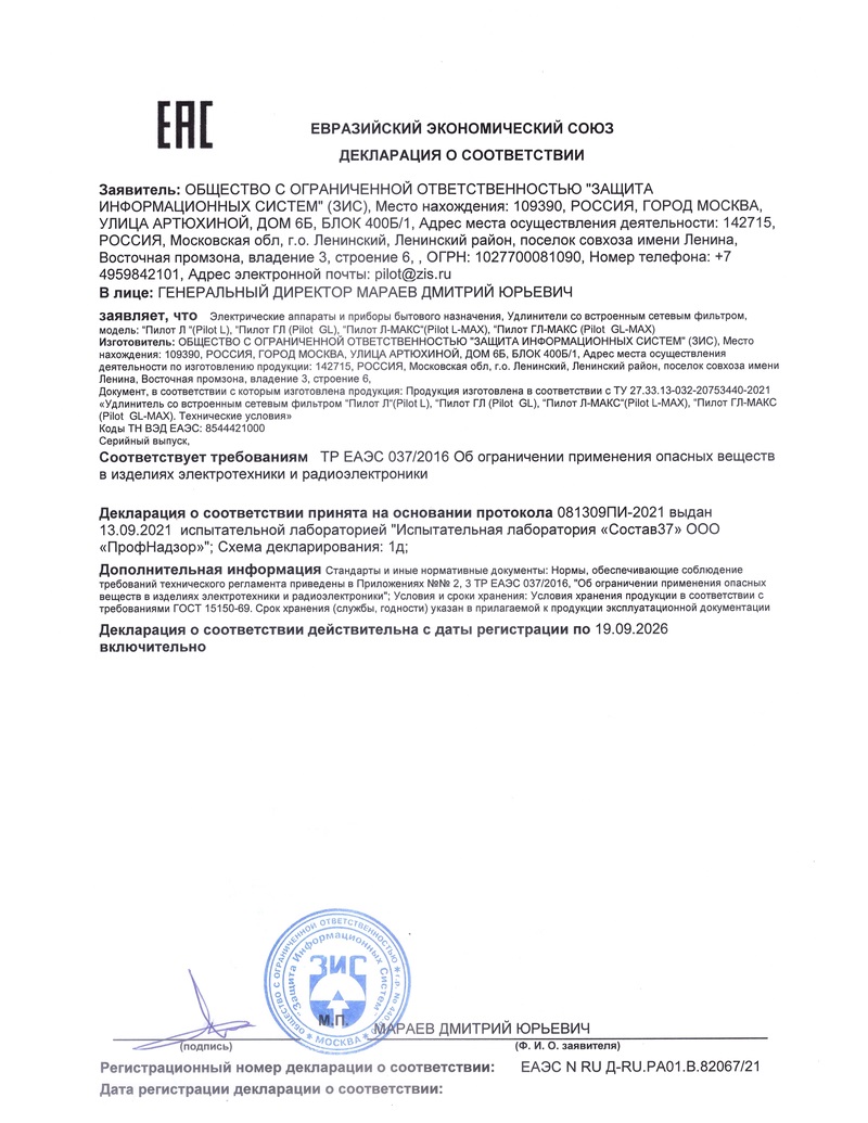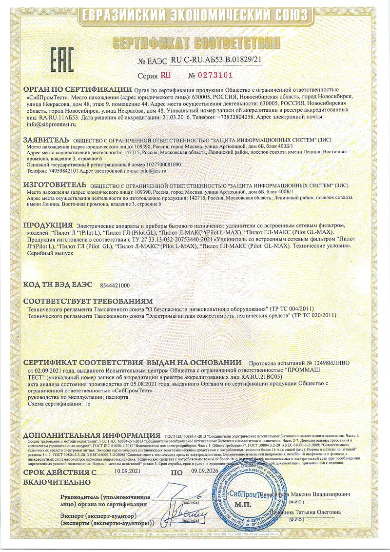 | Сетевой фильтр Pilot L (GP) 174 7м (6 розеток) белый (коробка) | ЕАЭС RU С-RU.АБ53.В.01829/21 | 09.09.2021 | 08.09.2026 |