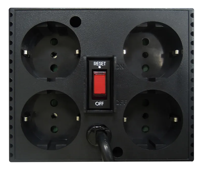 эффективность до 95%, потребляемая мощность менее 10 Вт, варистор для защиты от всплексов напряжения, стабилизация выходного напряжения +/- 5%, индикатор включения, индикатор пониженного напряжения, индикатор повышенного напряжения, все розетки оборудован -