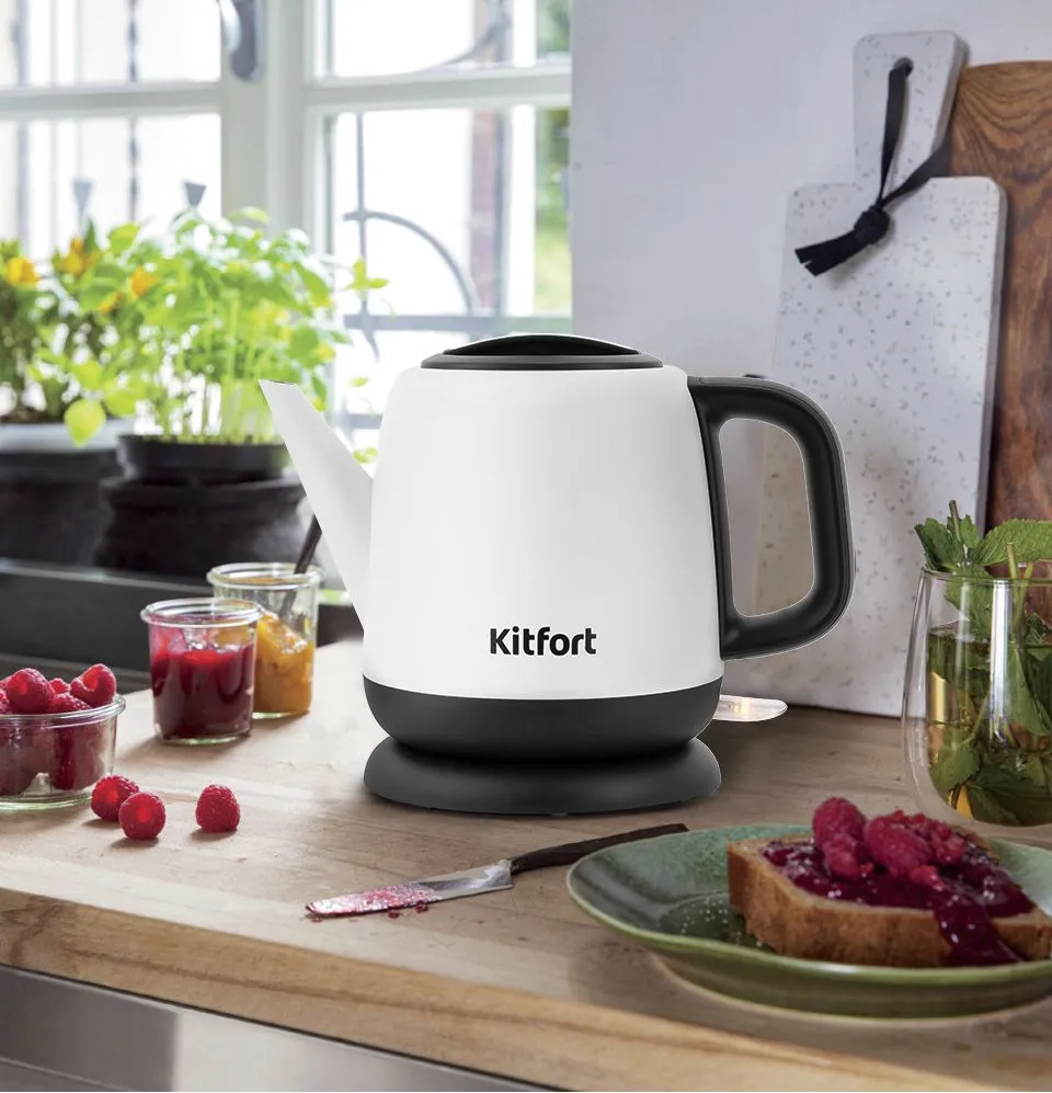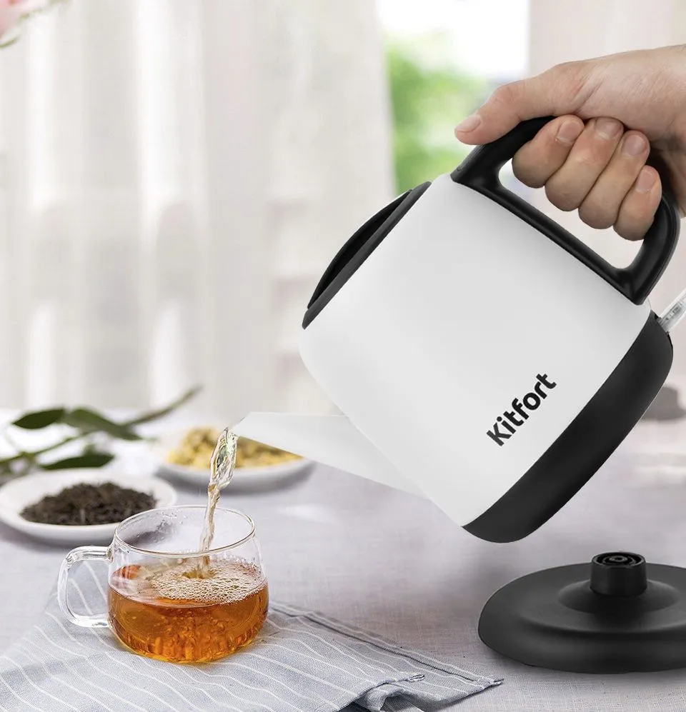 Корпус чайника Kitfort KT-6112 и крышка выполнены из сочетания пластика и нержавеющей стали, а подставка из пластика. Прибор имеет защиту от перегрева и от включения без воды: при включении без воды чайник нагревается и отключается. -