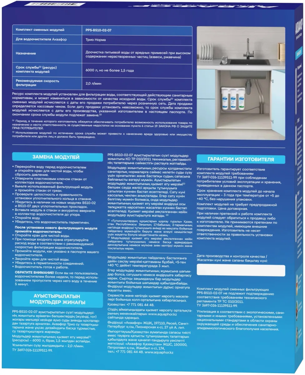 Комплект сменных модулей РР5-В510-02-07. Обеспечивает глубокую очистку воды от хлора, органических соединений и других примесей. -