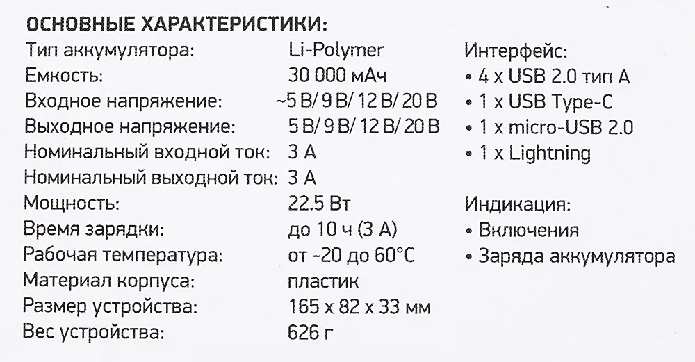 Входы: micro-USB, USB-C, Lightning; выходы 4 х USB-A, USB-C. Мощность 22.5 Вт, поддержка сквозной зарядки, QC 4.0+, Power Delivery (22.5W), HUAWEI FCP. -