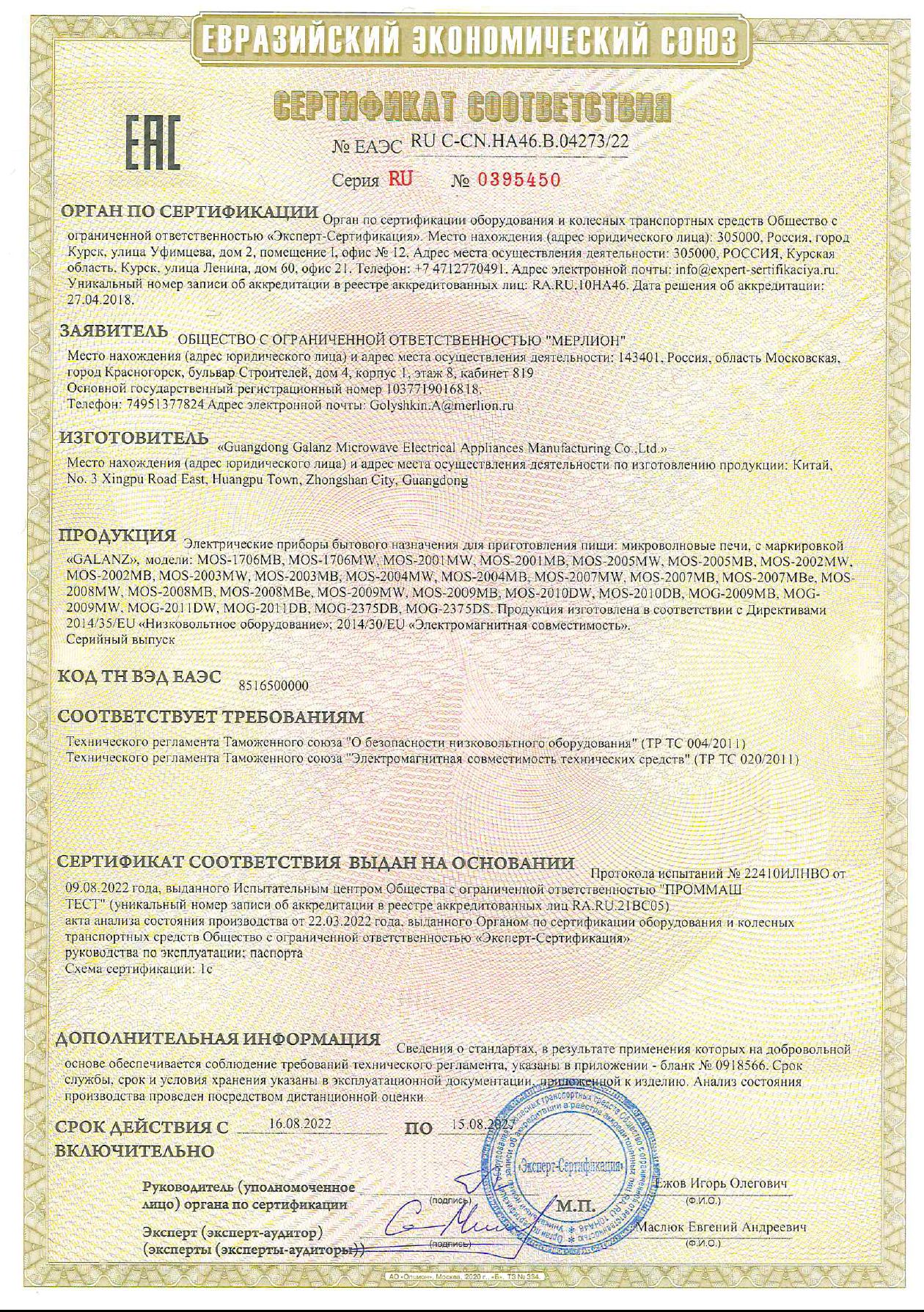 ЕАЭС RU С-CN.НА46.В.04273/22 | 15.08.2022 | 14.08.2027 |