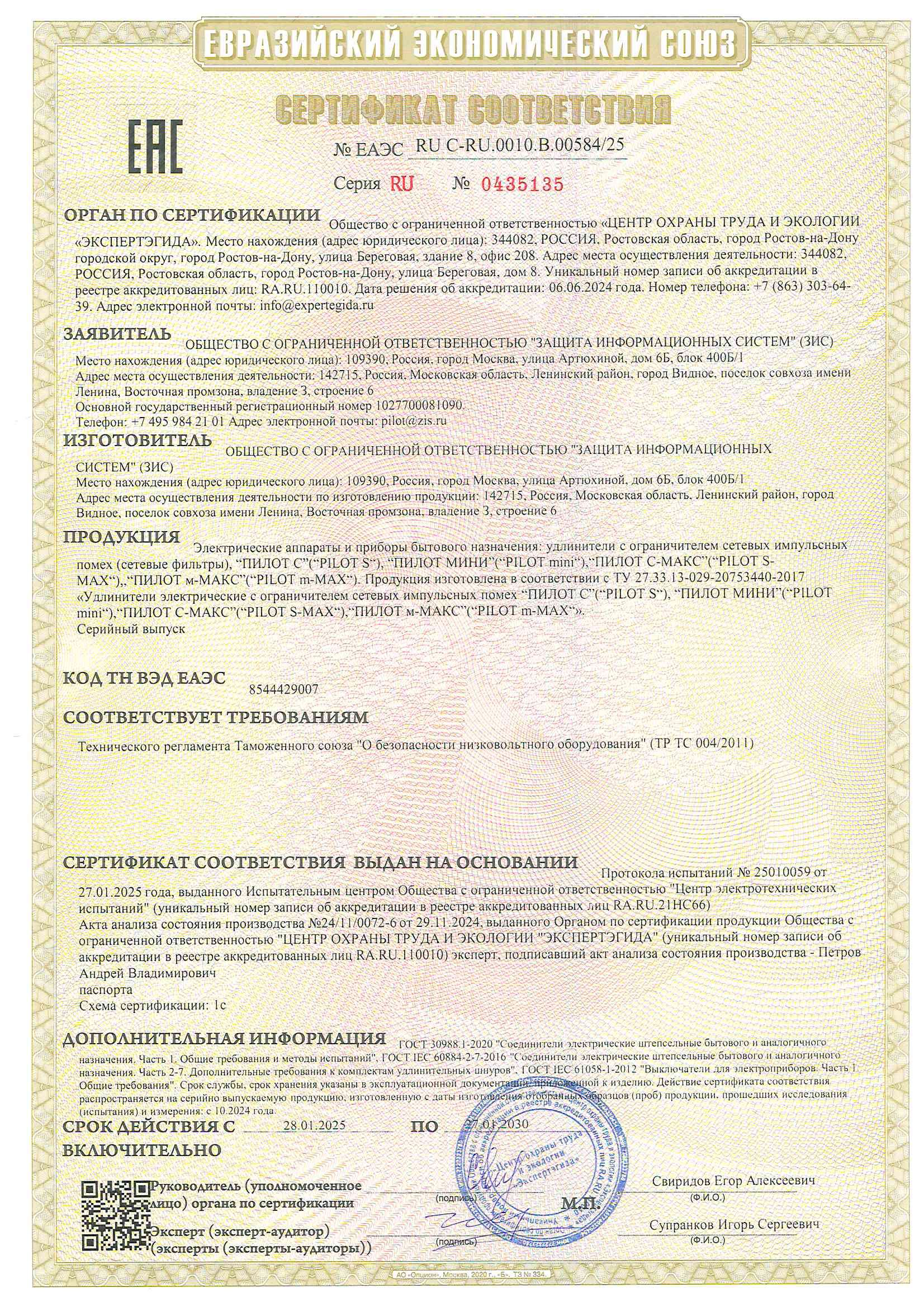 | Сетевой фильтр Pilot S 7м (6 розеток) белый (коробка) | ЕАЭС RU С-RU.0010.В.00584/25 | 27.01.2025 | 26.01.2030 |