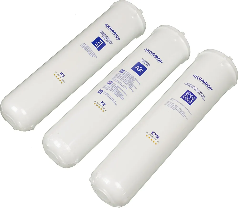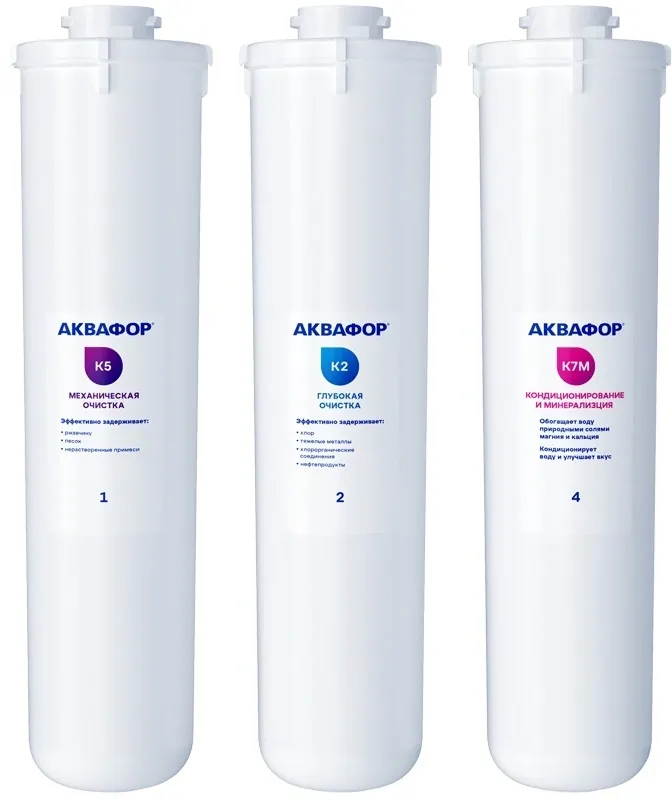 Модуль К5 - предварительная сорбционная очистка питьевой воды (для частиц размером 5 мкм). Модуль К2 - глубокая сорбционная доочистка питьевой воды (для частиц размером 3 мкм). Модуль К7M - финишная сорбционная очистка и кондиционирование питьевой воды (д -