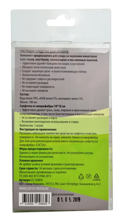 Чистящий набор (салфетки + спрей) Cactus CS-S3001E для экранов и оптики 1шт 18x18см 100мл | ОТКАЗ_ТРТС RU ..ОТКАЗНОЕ | 14.07.2024 | 13.07.2025 |