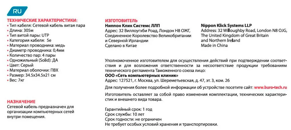 Кабель сетевой Buro BU-COP-040 UTP 4 пары cat5E solid 0.40мм Cu 305м (BU-COP-040)