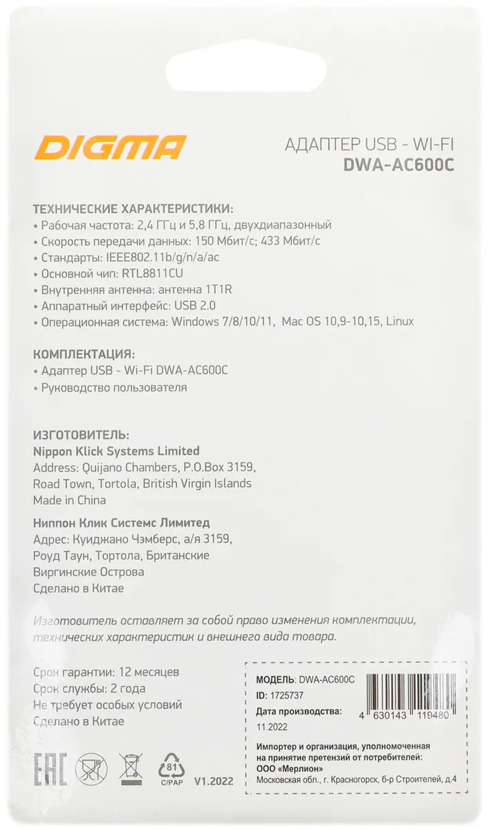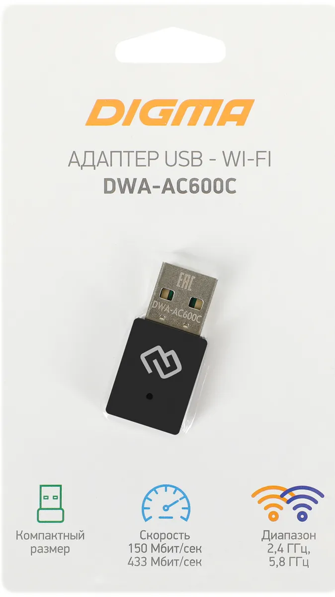 Сетевой адаптер Wi-Fi Digma DWA-AC600C AC600 USB 2.0 (DWA-AC600C)