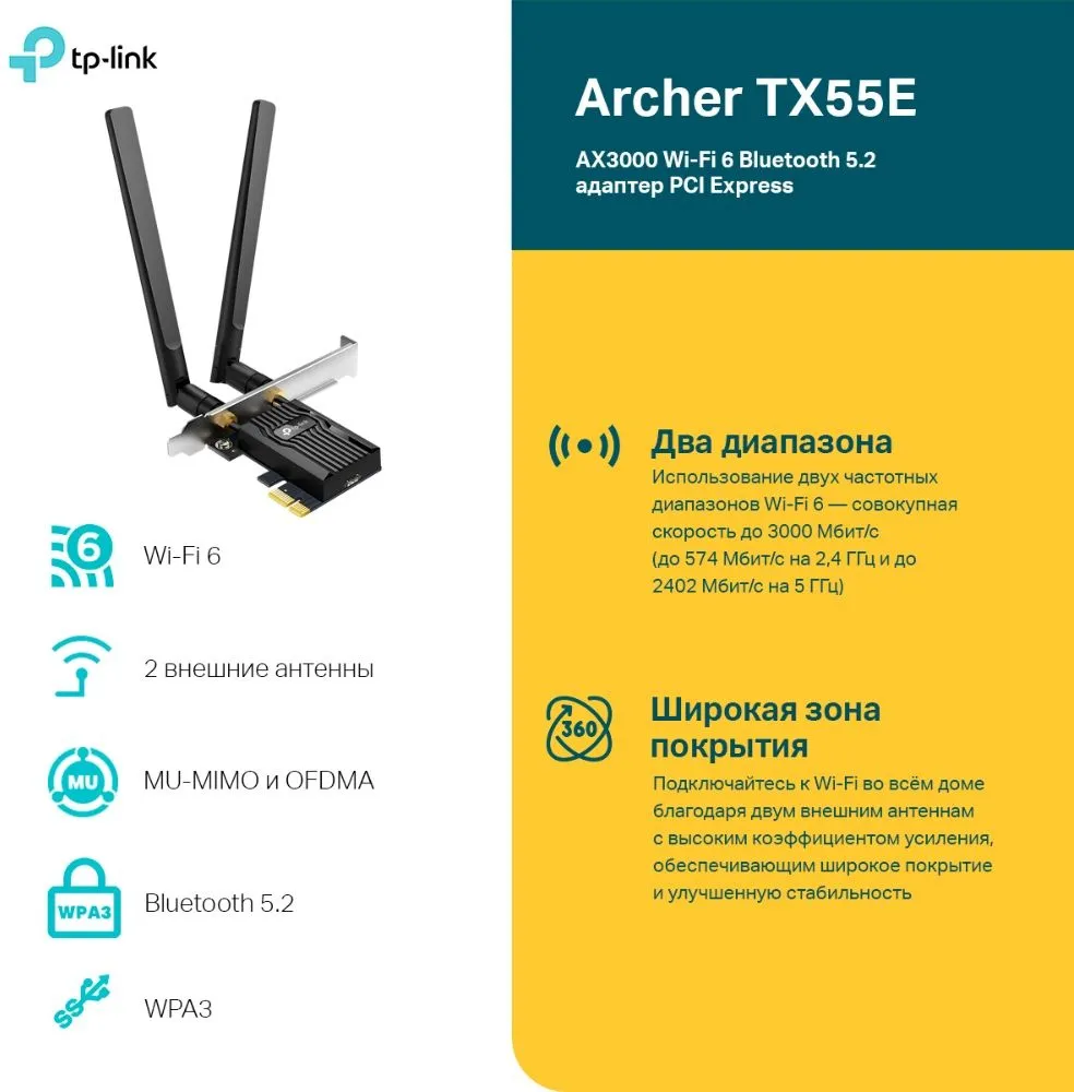 TP-Link ARCHER TX55E, AX3000 Двухдиапазонный адаптер Wi-Fi 6 Bluetooth PCI Express, до (ARCHER TX55E)