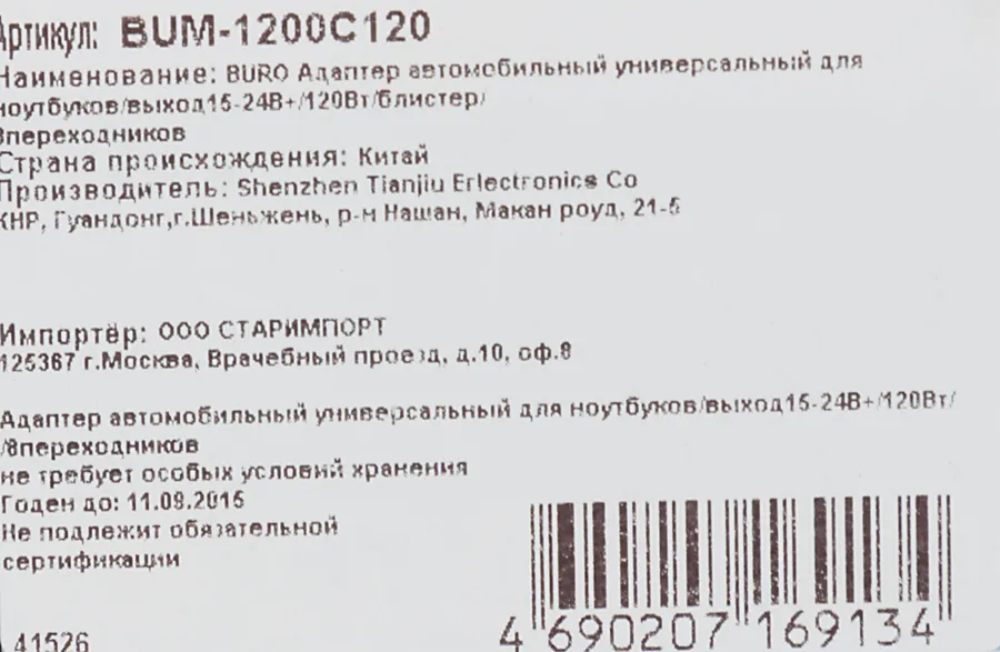 Блок питания Buro BUM-1200C120 ручной 120W 15V-24V 11-connectors 5A 1xUSB 2A от прикуривателя | ЕАЭС RU С-VG.АД11.В.00003/22 | 20.06.2022 | 19.06.2027 |