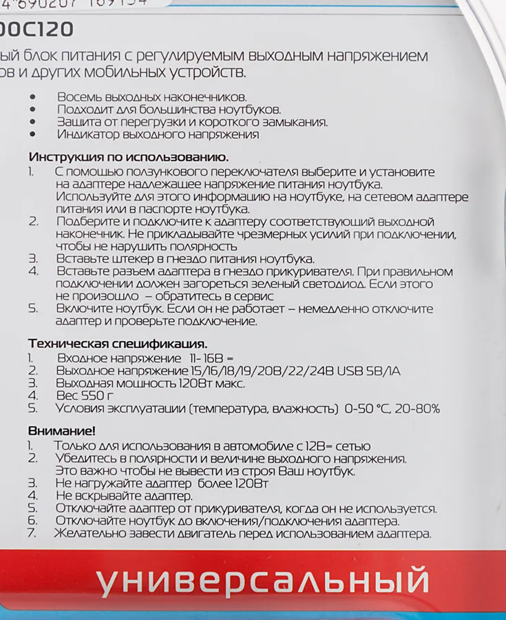 Универсальный автомобильный адаптер для ноутбуков мощностью 120 ватт и USB-портом для зарядки мобильных телефонов и планшетов. В комплекте входят 11 сменных штекеров, подходящих к большинству ноутбуков. Выбор мощности для питания происходит в ручном режим -