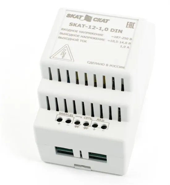 12 В, 1 А. Пластиковый корпус с креплением на DIN-рейку. Внешняя АКБ от 1,2 до 12 Ач. -