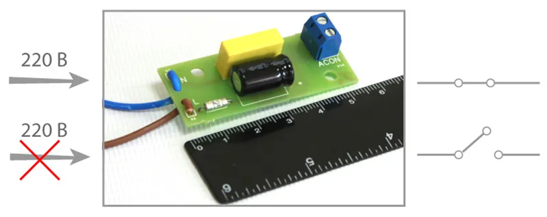 Датчик наличия сети 220 В. Датчик представляет собой устройство для выдачи информационного сообщения о наличии напряжения в электрической сети в формате «СУХИЕ КОНТАКТЫ РЕЛЕ» и реализован в виде модуля с гибкими проводниками и выходной колодкой. Датчик об