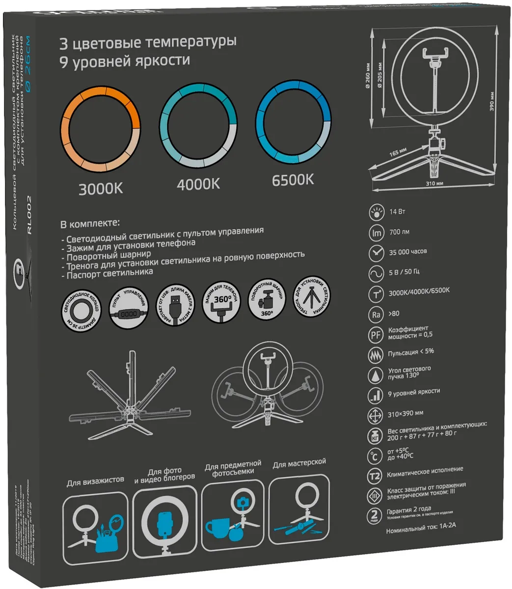 Светильник, зажим для смартфона, тренога, паспорт светильника -