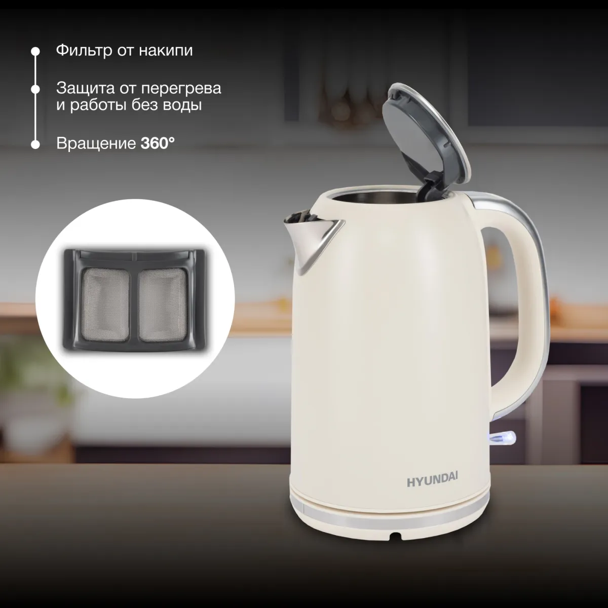 кнопка открытия крышки, подставка 360, фильтр от накипи -