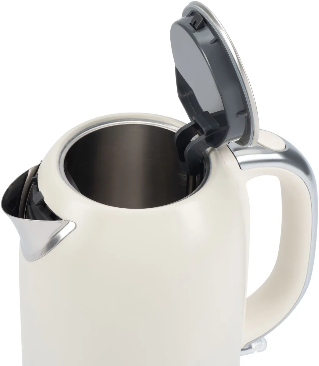 Крышка открывается на 85 для удобства заполнения и/или очистки чайника. Съемный фильтр от накипи и шкала уровня воды под ручкой с указанием количества чашек. -