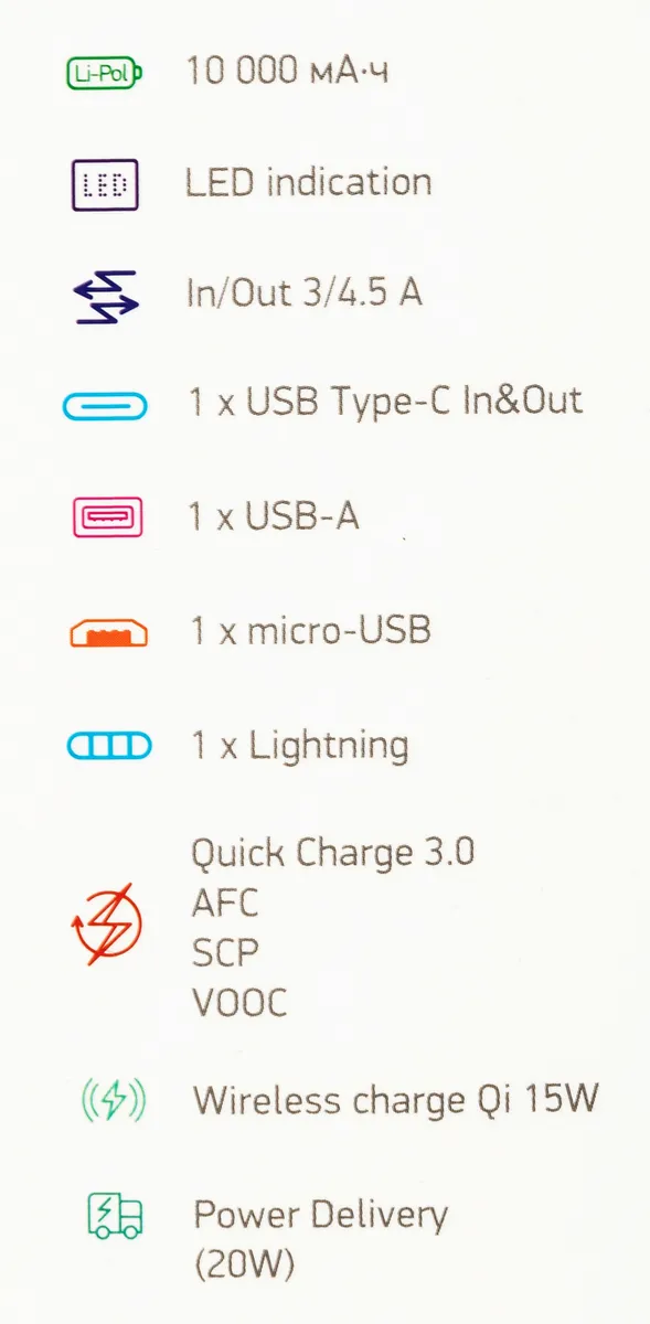 Входы: micro-USB, USB-C, Lightning; выходы: USB-A, USB-C. Мощность 22.5 Вт, поддержка сквозной зарядки, беспроводная зарядка Qi 5/7.5/10W, быстрая зарядка QC 3.0, Power Delivery (20W), HUAWEI SCP, Samsung AFC, Oppo VOOC -